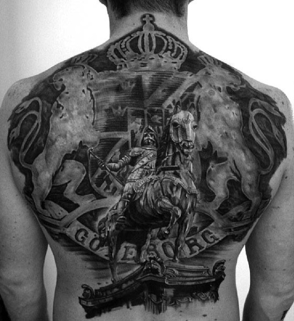 背部写实风格的黑色古罗马雕塑和皇冠纹身图案