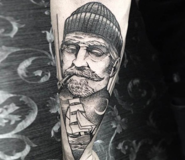 手臂黑白风格老水手与船纹身图案