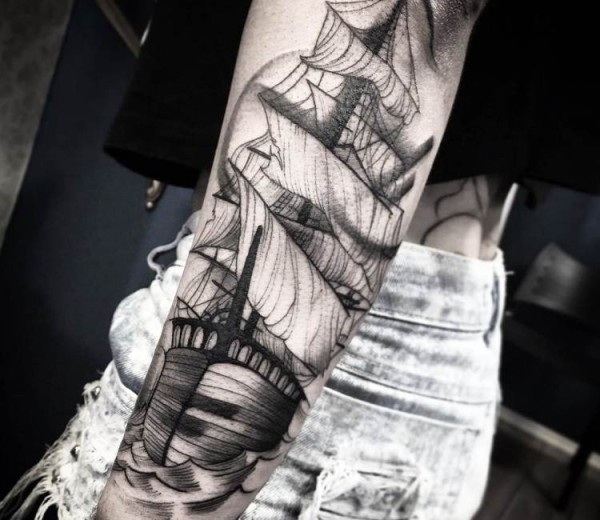手臂黑色线条帆船纹身图案