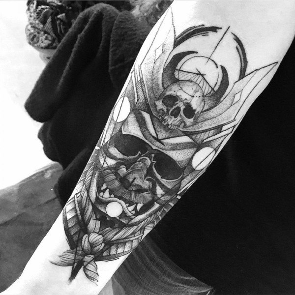 小臂壮观的点刺风格黑色武士面具纹身图案