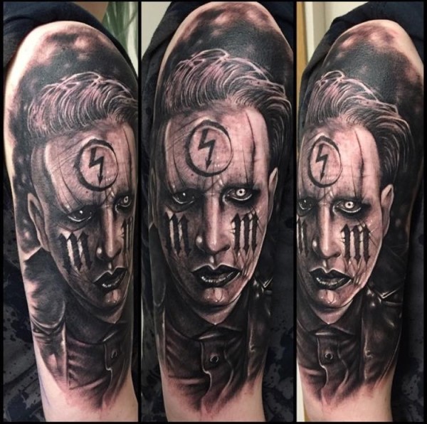 大臂写实风格黑色人物肖像闪电符号纹身图案