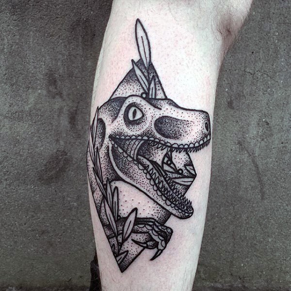 小腿黑色点刺恐龙个性纹身图案