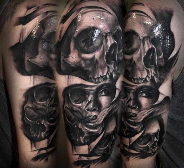 大臂黑灰恶魔般的女人肖像骷髅纹身图案