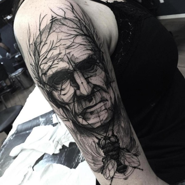 大臂雕刻风格黑色人像与苍蝇纹身图案