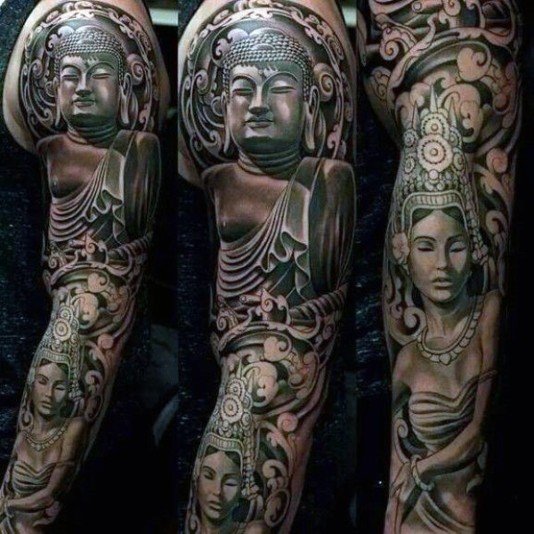 黑灰风格手臂如来佛祖和女性雕像纹身图案