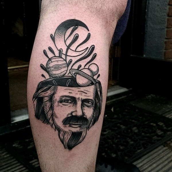 小腿超现实主义风格黑色男人头行星纹身图案