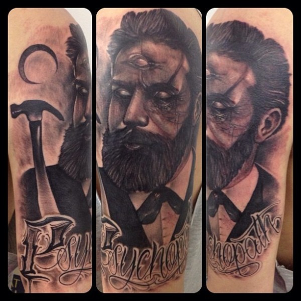 手臂黑灰风格神秘男子三只眼和字母纹身图案
