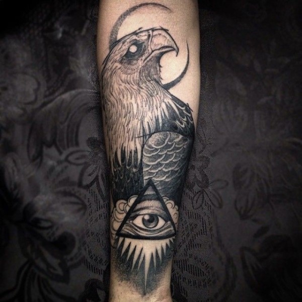 手臂黑灰鹰与神秘的眼睛纹身图案