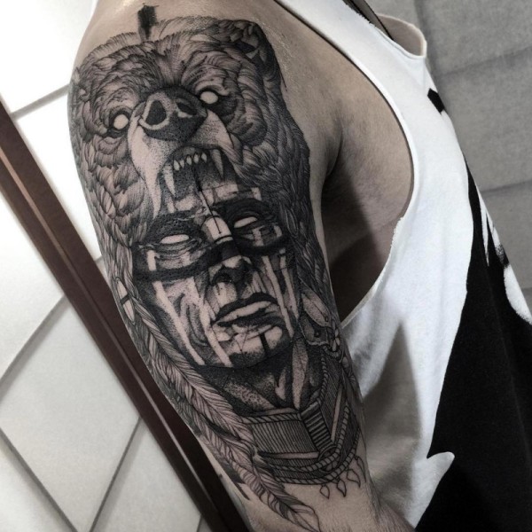大臂黑色恶魔印度人像狼头纹身图案