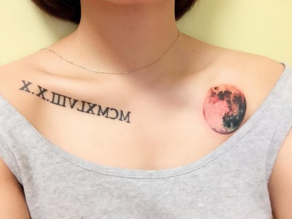 肩部彩色的小尺寸月球和黑色罗马数字纹身图案