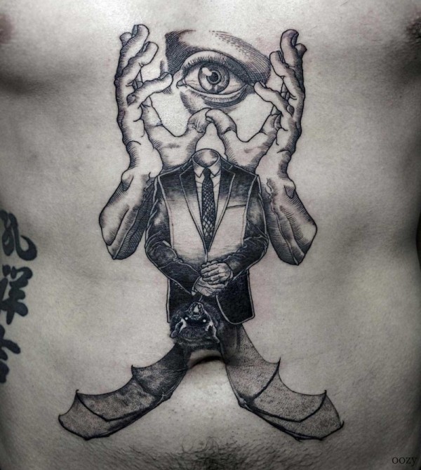 腹部奇怪的超现实主义风格黑色手眼睛人体纹身图案