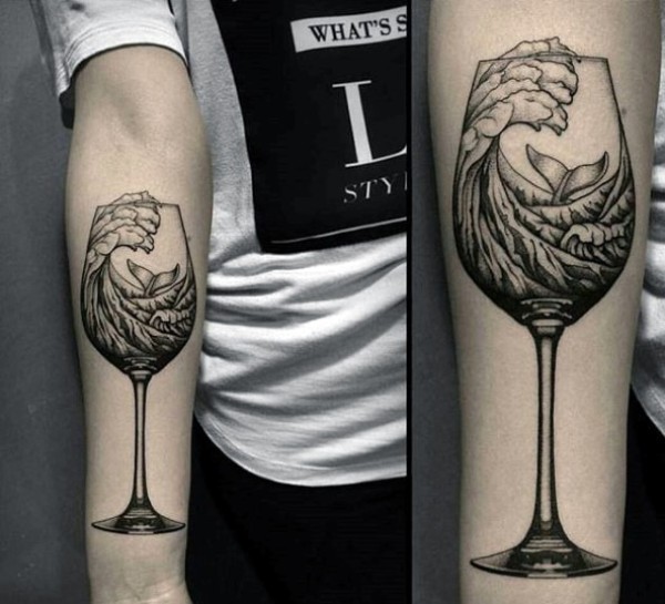 手臂酒杯黑白与超现实主义风格海浪鲸鱼纹身图案