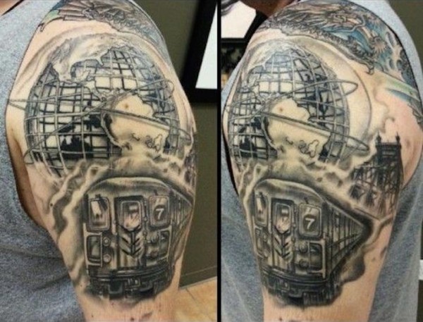 肩部纽约主题的黑白城市火车和地球纹身图案