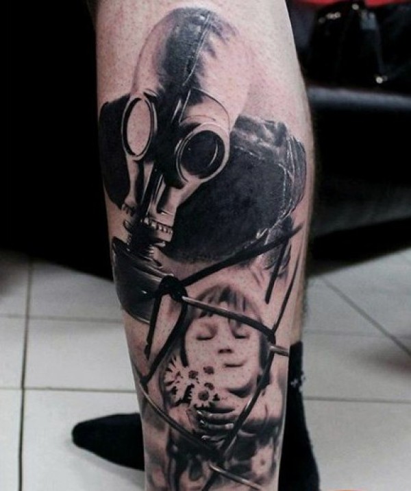 小腿神秘的黑灰防毒面具和男孩纹身图案