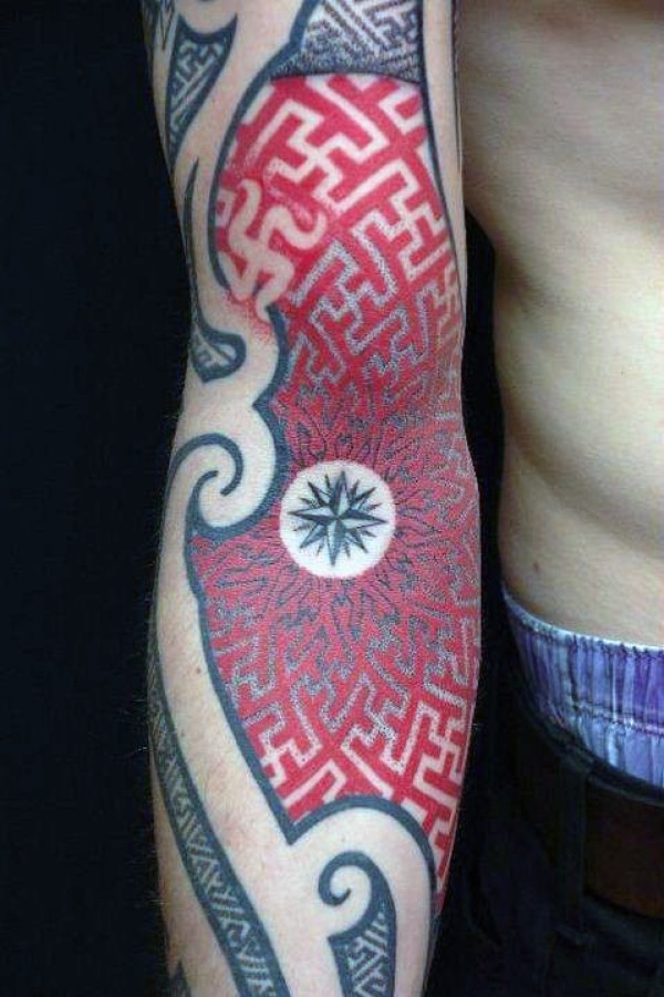 手臂原始红色几何与黑色星星纹身图案