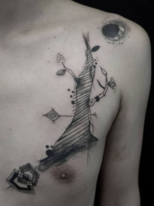 胸部超现实主义风格黑色线条有趣的树与月亮纹身图案
