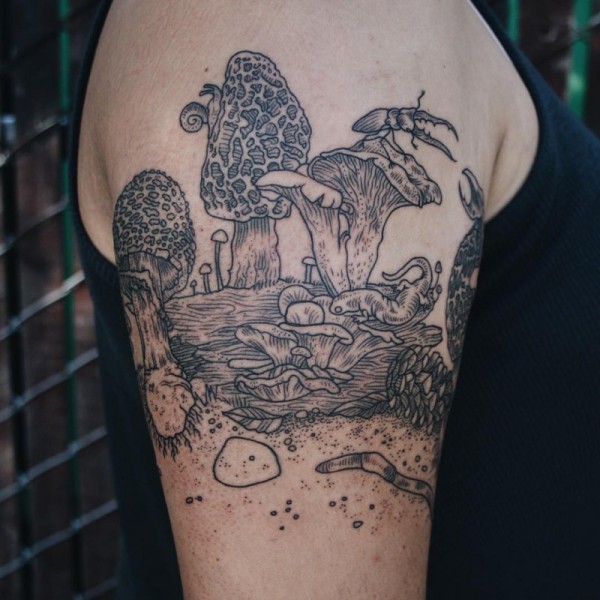 大臂华丽的雕刻风格黑色线条蘑菇纹身图案