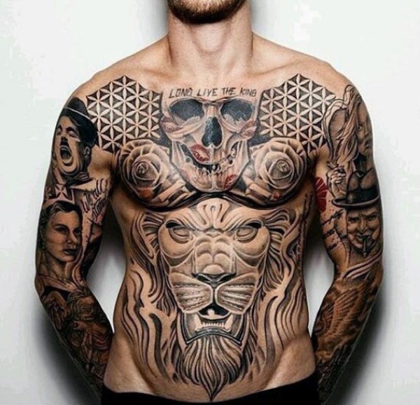 腹部和胸部黑色狮子和字母骷髅纹身图案