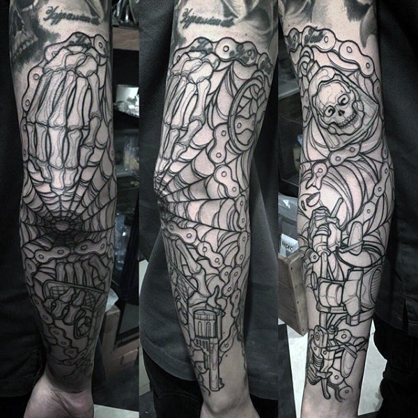 手臂壮观的黑色蜘蛛网与骷髅自行车链纹身图案