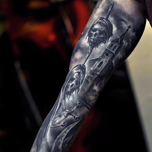 手臂恐怖风格黑色人头与毛骨悚然的房子纹身图案