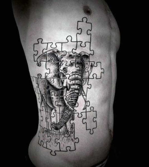 侧肋雕刻风格黑色拼图与大象纹身图案