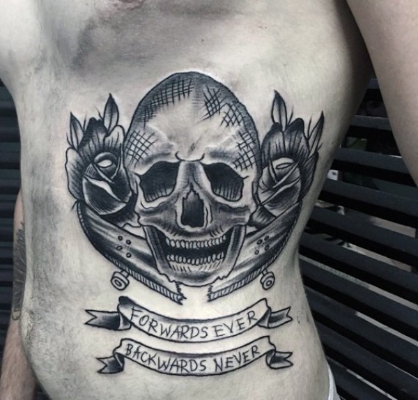 侧肋黑色滑板和字母骷髅纹身图案
