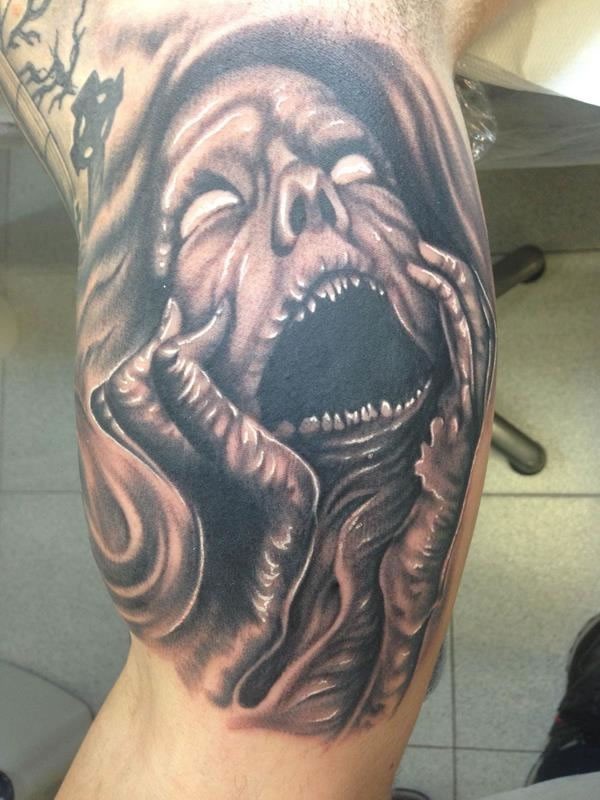 黑色恐怖风格怪物女人脸上大臂纹身图案