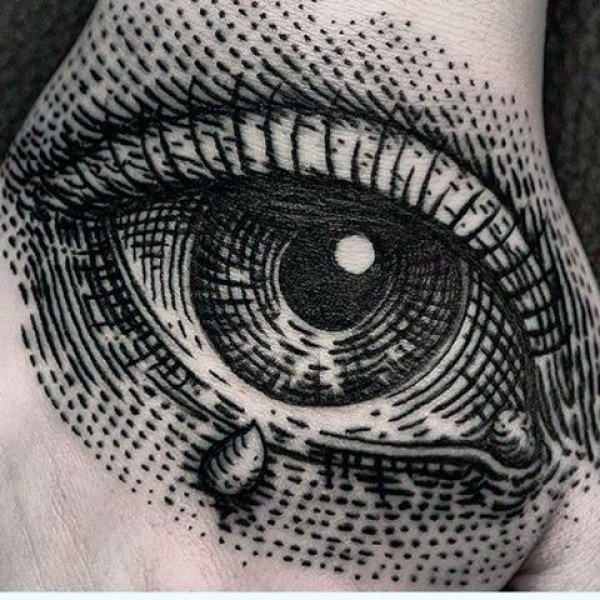 手背点刺风格黑色人类眼睛纹身图案