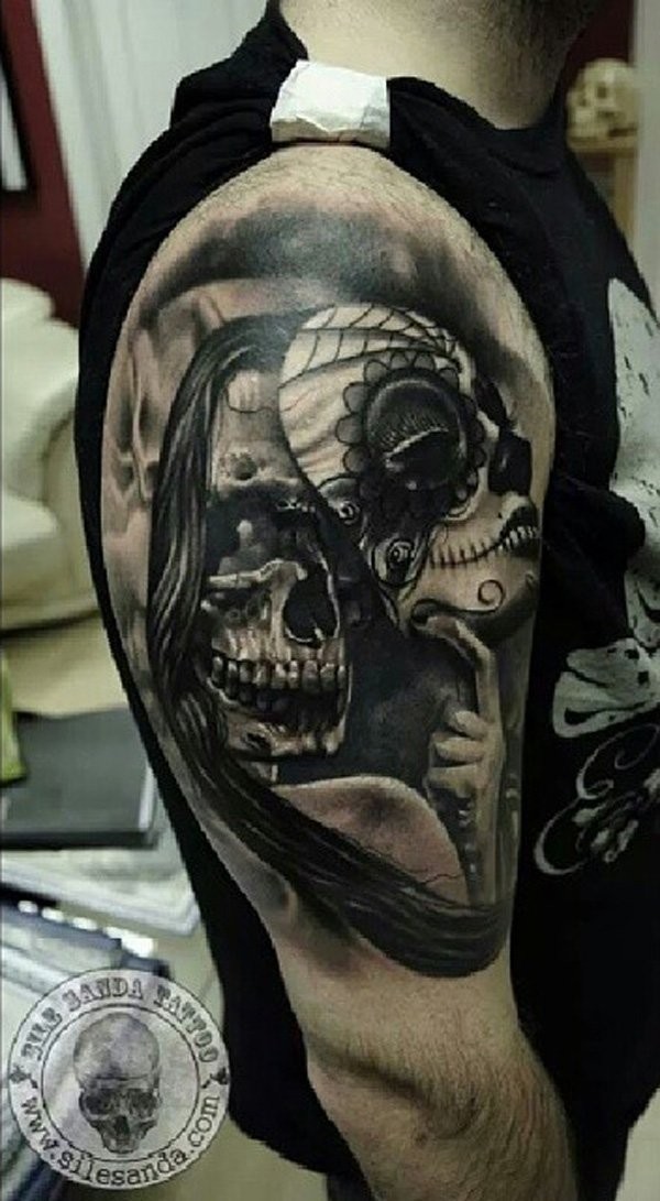 大臂new school黑白怪物女子墨西哥传统面具纹身图案