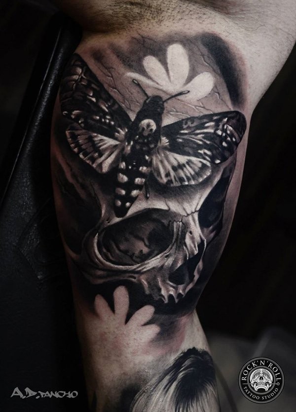 大臂内侧写实的黑白骷髅和蝴蝶纹身图案