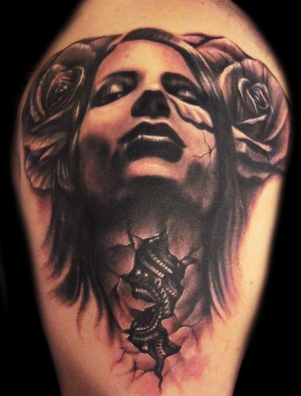 黑灰壮观风格损坏的女人肖像和玫瑰纹身图案