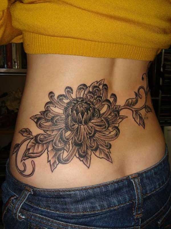 腰部黑灰风格的大菊花纹身图案