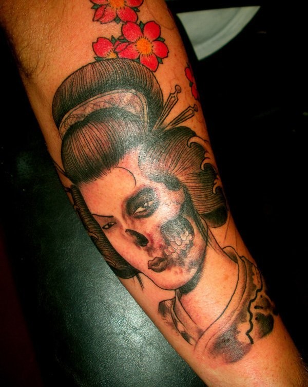 小臂复古风格的黑色恐怖僵尸艺妓画像纹身图案