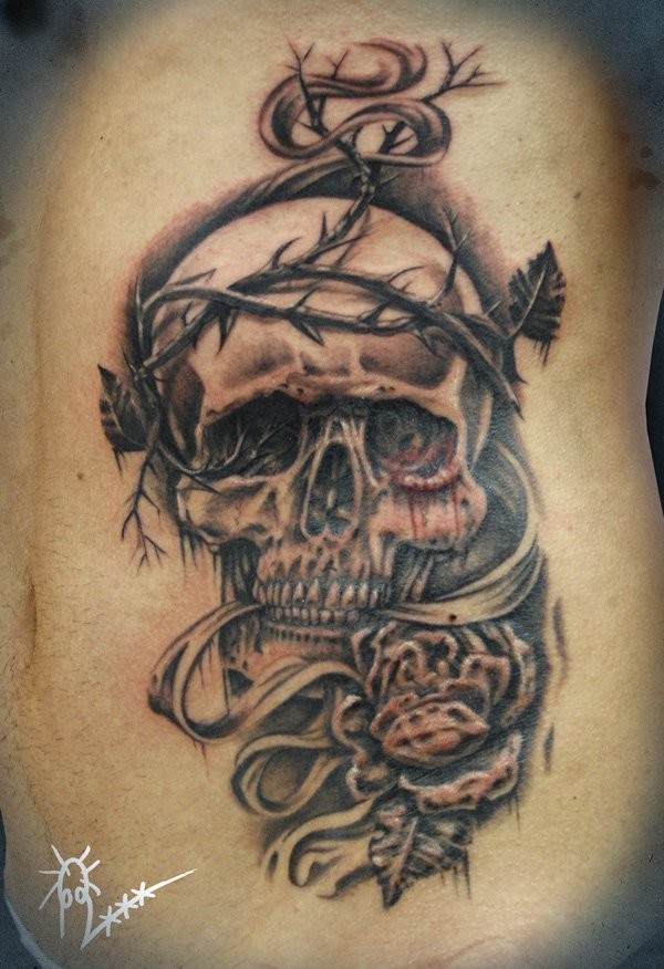 侧肋黑灰色的荆棘和血腥的眼睛骷髅纹身图案