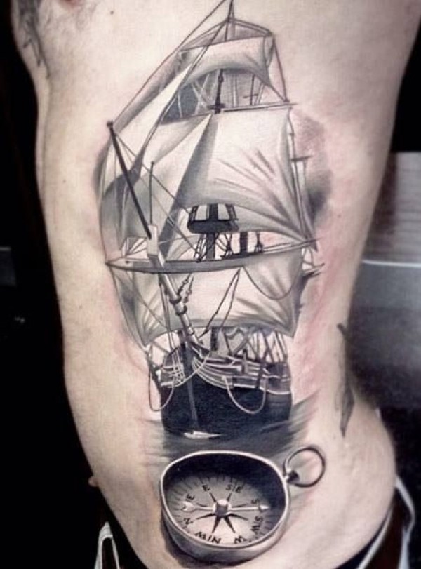 侧肋写实风格的黑白帆船与指南针纹身图案
