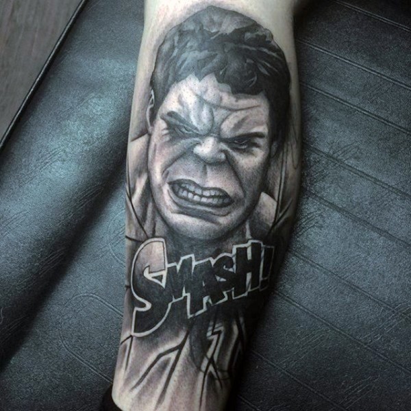 黑白愤怒的绿巨人肖像和字母纹身图案