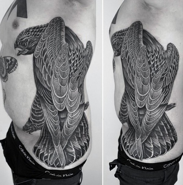 神奇的黑色鹰和蝴蝶侧肋纹身图案