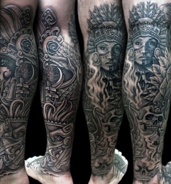 小腿黑白难以置信的玛雅部落妇女和雕塑纹身图案