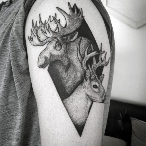 几何形状与黑色麋鹿大臂纹身图案
