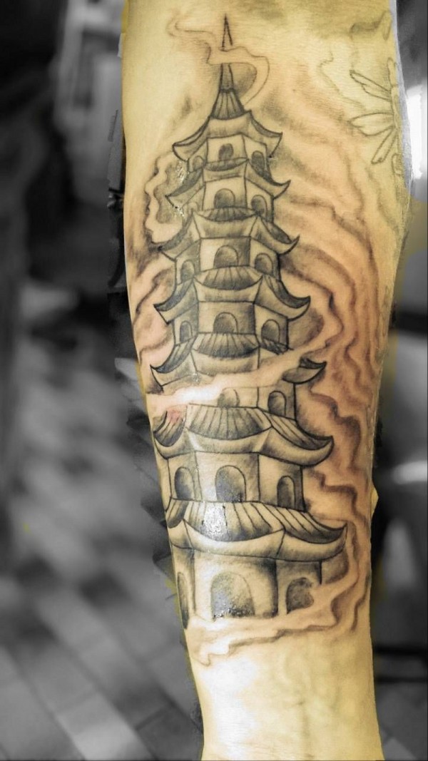 简单个性的黑色古代寺庙烟雾纹身图案