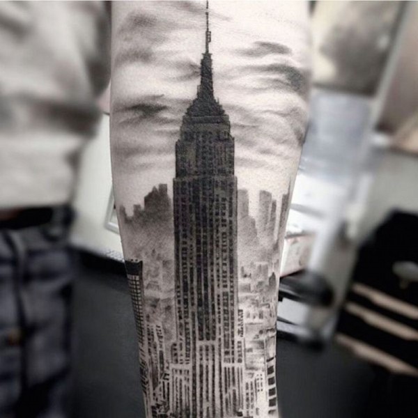 手臂写实逼真的黑白美国帝国大厦纹身图案