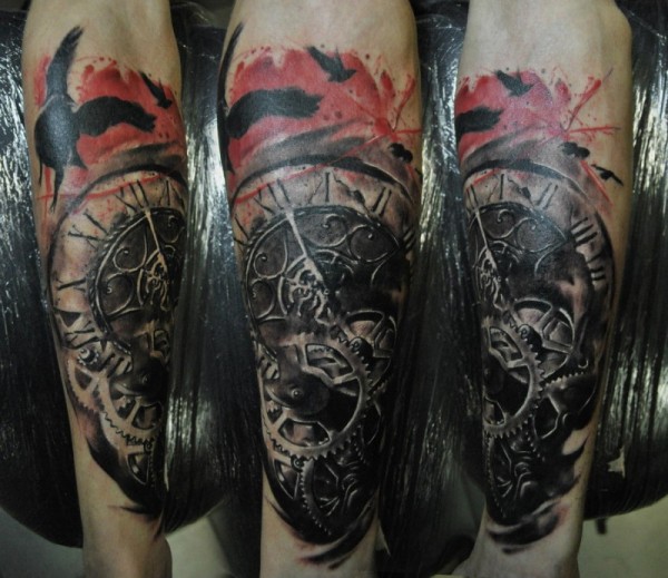 惊人的现代风格旧机械时钟纹身与乌鸦小臂纹身图案