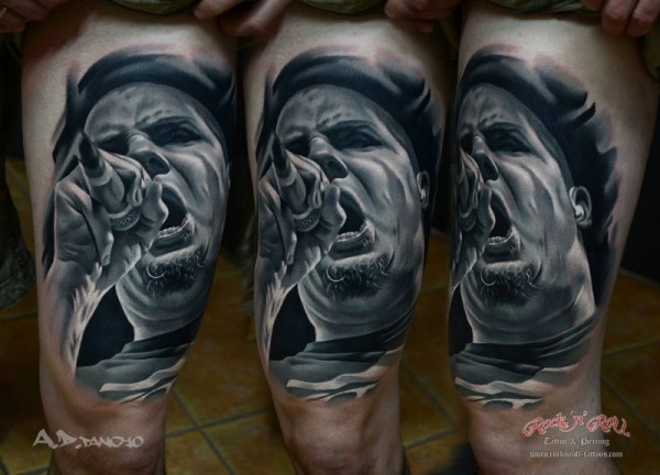 大腿黑白逼真的音乐歌手肖像纹身图案