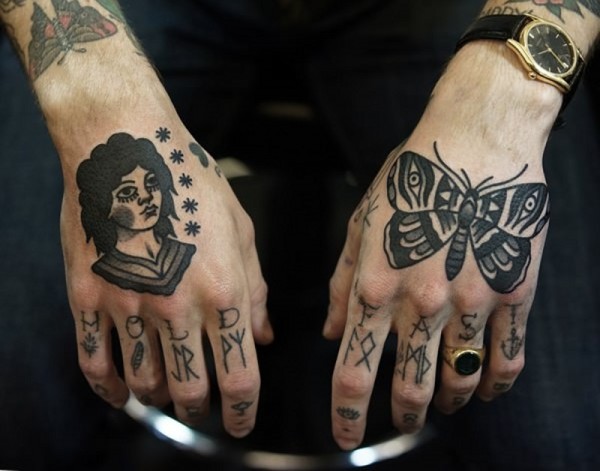 手背old school黑白肖像与字母蝴蝶纹身图案