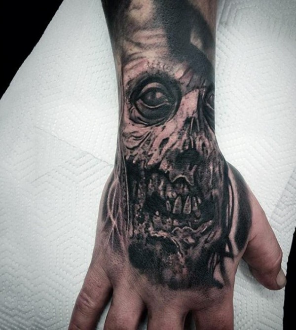 手背惊人的黑白恐怖僵尸脸纹身图案