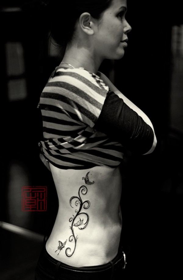 女生后腰纹身黑白灰风格抽象线条纹身图案