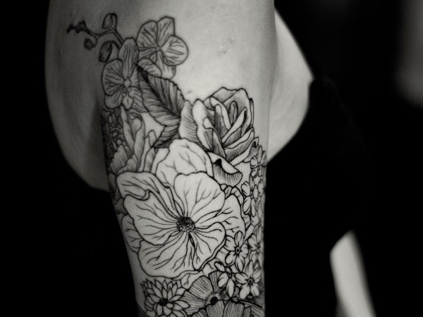 男人大臂黑白彼岸花骷髅_黑白纹身图案大全_纹身图吧