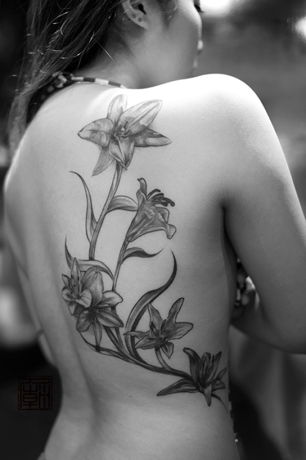 女生后腰纹身黑白灰风格抽象线条纹身图案