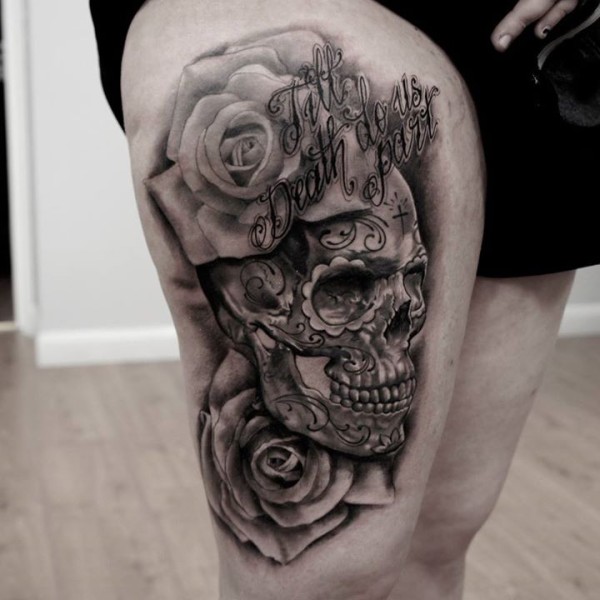 墨西哥传统的黑白骷髅玫瑰和字母大腿纹身图案