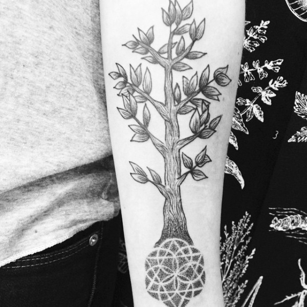 手臂简易的黑色树与观赏花卉结合纹身图案